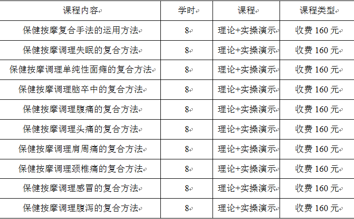 課程安排:保健按摩特色課程以中醫(yī)基礎(chǔ)為主,收費1380元【共十天,課程詳情見上圖】,單項培訓(xùn)依據(jù)課程大綱價格而定,單項160元/節(jié),不可享受優(yōu)惠。參加培訓(xùn)學(xué)員食、宿、交通費自理。