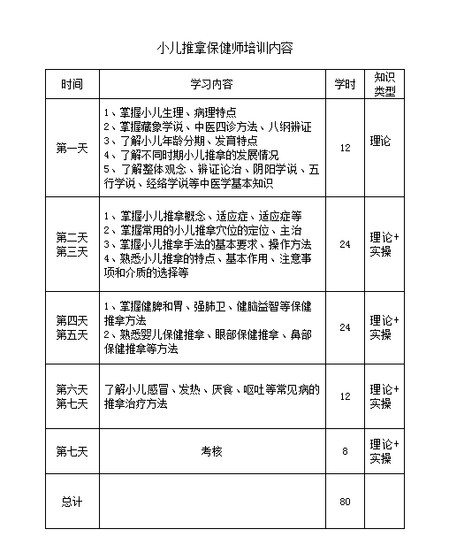 初級小兒推拿保健師培訓時間為7天,共80學時,保證學員學會小兒推拿保健基本理論和基本技能,培訓合格頒發(fā)烏蘭察布醫(yī)學高等專科學校培訓合格證書。
