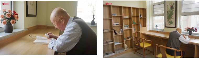 在烏蘭美康養(yǎng)院的圖書室里,人們常常會(huì)看到一位老人拿著放大鏡在埋頭讀書,一讀就是2小時(shí)。談及爺爺?shù)拈喿x愛(ài)好,老人家興奮地說(shuō):“我每天早上起來(lái),在康養(yǎng)院內(nèi)散散步。九點(diǎn)左右就去康復(fù)訓(xùn)練室里用按摩椅活動(dòng)活動(dòng)筋骨,九點(diǎn)半左右我就去圖書室了,一般看兩小時(shí)的書。每天中午和晚上睡覺(jué)前,我是一定要看一小時(shí)書的,這已經(jīng)成為了生活‘必需品’。”不少人感嘆王爺爺?shù)淖月?,他卻打趣道:“我也是勞逸結(jié)合!午睡后,我會(huì)到活動(dòng)室打兩小時(shí)的麻將。”