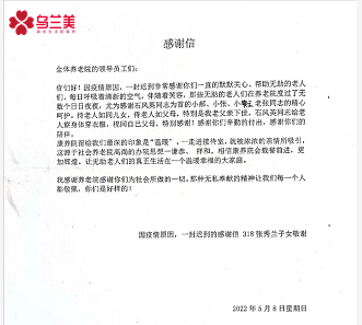 隨著錦旗一起送進(jìn)來的還有一封致謝烏蘭美康養(yǎng)院全體工作人員的感謝信,來信人是在康養(yǎng)院入住的張秀蘭奶奶的子女,他們在信中感謝工作人員對張奶奶的悉心呵護(hù)、專業(yè)照顧、辛勤付出和陪伴,更稱贊康養(yǎng)院為所有的老人提供了一個幸福溫暖的大家庭,最后祝愿康養(yǎng)院的明天更加輝煌。